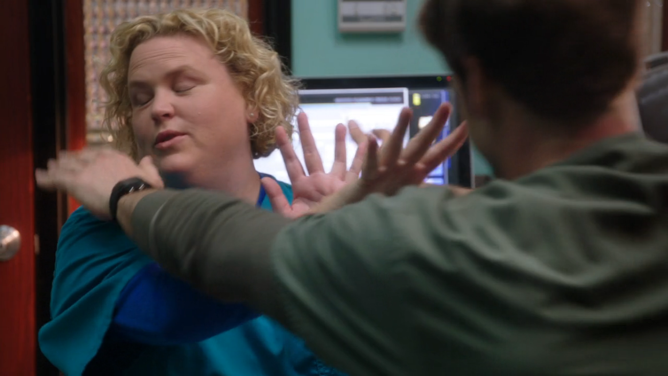 At work, Mindy responds to questioning from a slightly nervous Jody: “What am I doing here? That’s like asking Rihanna what she’s doing at the met ball. I’m the queen of this ish.” She learns she’s going to be doing a hysterectomy with Jody. But it goes beautifully. At the end, Jody and Mindy celebrate with whiskey. Mindy’s impressed: “Whoa, a flask? Mine was confiscated at an American Girl store.” I’d really like to see a flashback of that incident on the show someday. Jody is sad she’s not going to be around for his triplet delivery later this week.