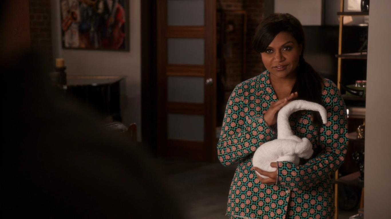 That’s when she realizes the bed has been made with “hotel-quality bed corners.” She marches out and tries to guilt Danny into confessing with a towel swan. “It’s funny, because I remember you telling me that origami was disrespectful to Pearl Harbor vets.” Hah! She wants him to show her how he did it. He wraps it around his hand like a boxing glove. Mindy throws the towel at him and calls him out. “You brought your mother in as a ringer to make me look bad.” He says it wasn’t to make her look bad: “My schedule was in shreds by twelve, I called Ma crying, OK? I couldn’t do it.” They commiserate over how hard it is: Leo always throws up on a new outfit, and cries with no sound coming out. Danny even says he wants to use diapers that are bad for the environment. Mindy’s ahead of him there: “I’ve already been using them, actually. I keep them in the ceiling with my candy.” He says he’s lucky he’s with someone who actually wants to do this every day. Mindy is once again working up the courage to contradict him on this when Little Danny calls to fuck everything up again. Danny’s dad has had a heart attack and he needs to go out there.