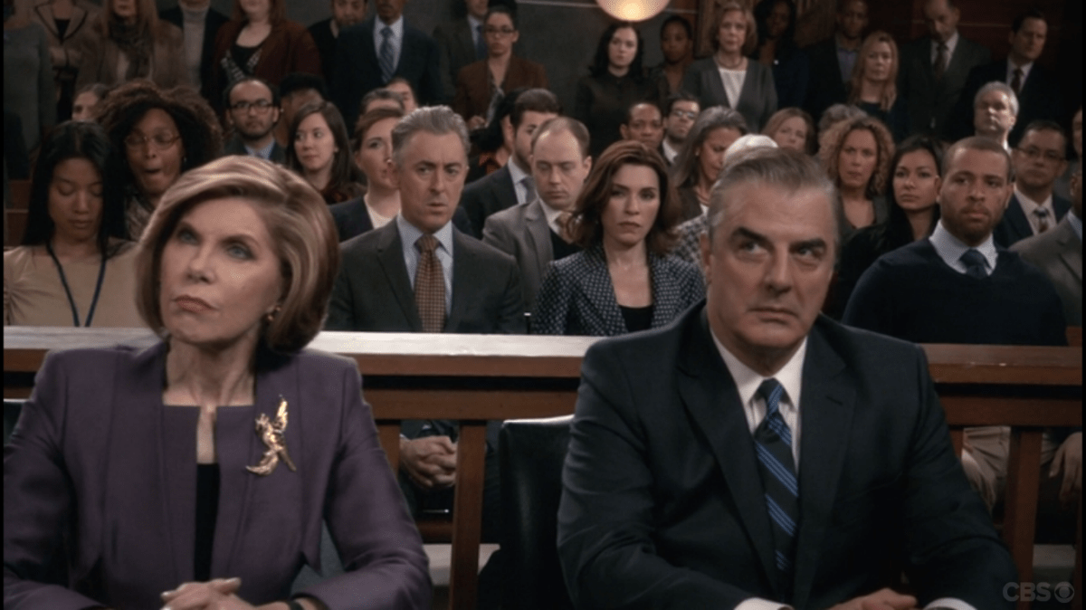 Lloyd Garber, Peter’s campaign donor and the father of the accused murderer in the Locke case, is testifying. I expected this to be very dramatic, after everyone kept wringing their hands and saying his full name for like five episodes straight, but it’s quite bloodless. Or rather, it’s a repeat of the same situation we’ve had with this whole plot line: it would be dramatic if we had known Lloyd Garber for years, but we haven’t, so he’s just some jerk that was friends with Peter and is now testifying against him. A very low-energy testimony, too. He describes visiting Peter when he found out about the case, and saying that he didn’t want him to go to jail. Apparently Peter responded that there was nothing to worry about, and two days later, the evidence went missing.