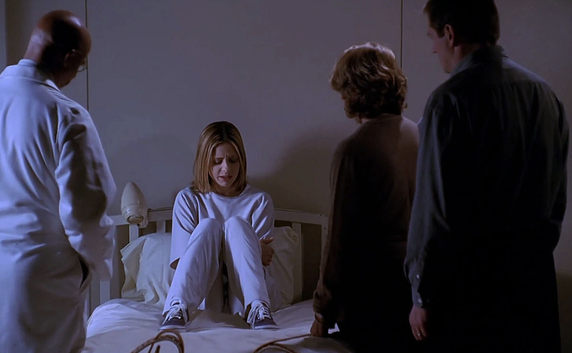 In the asylum timeline, Buffy is told that she’s actually been in the asylum for six years, and that her Slayer-ness is a hallucination. And? MRS. BUFFY IS ALIVE. Back in real life, Buffy confesses that when she saw her first vampire she was sent to an asylum. But she pretended to stop seeing them and her parents “just forgot.” She’s afraid she actually never left the clinic.